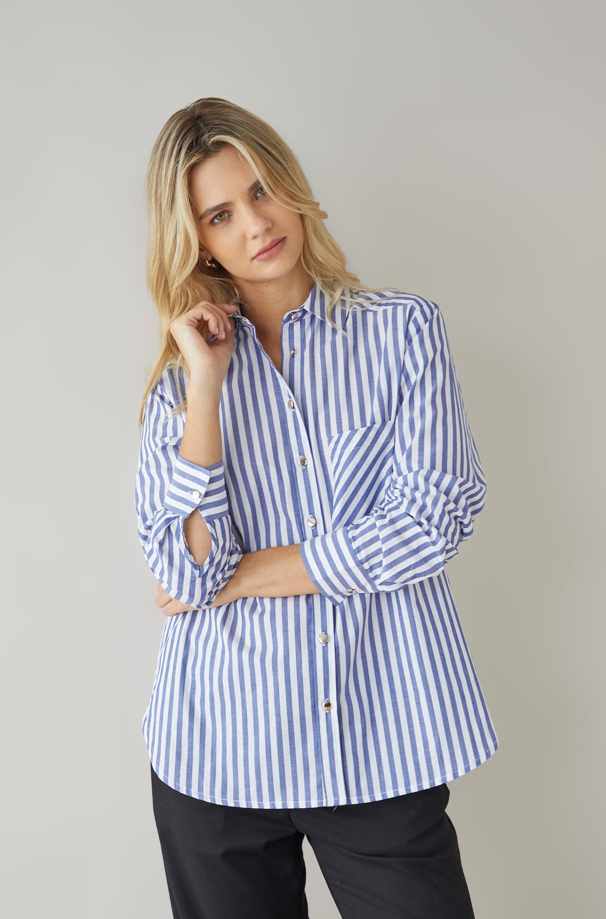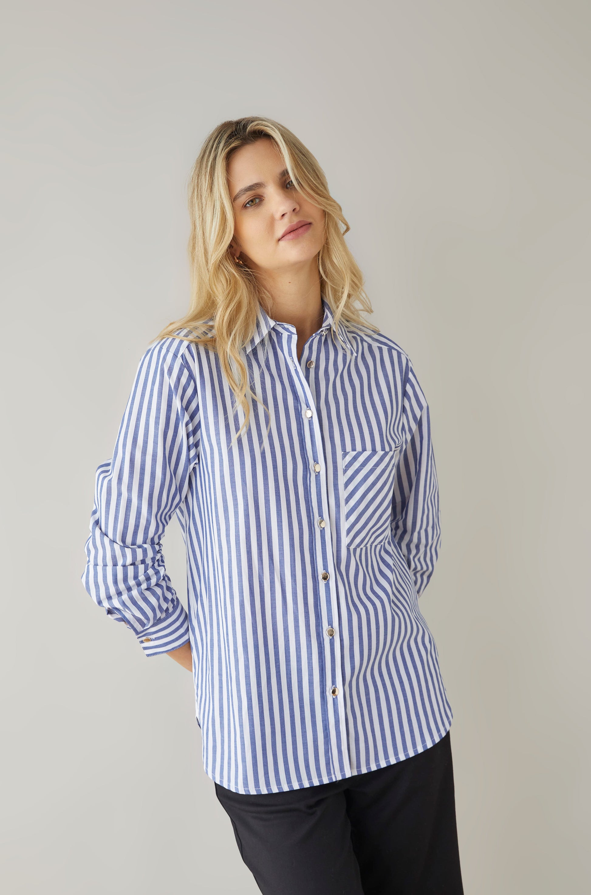 Blusa de cuello y solapa manga larga sin bolsillos.