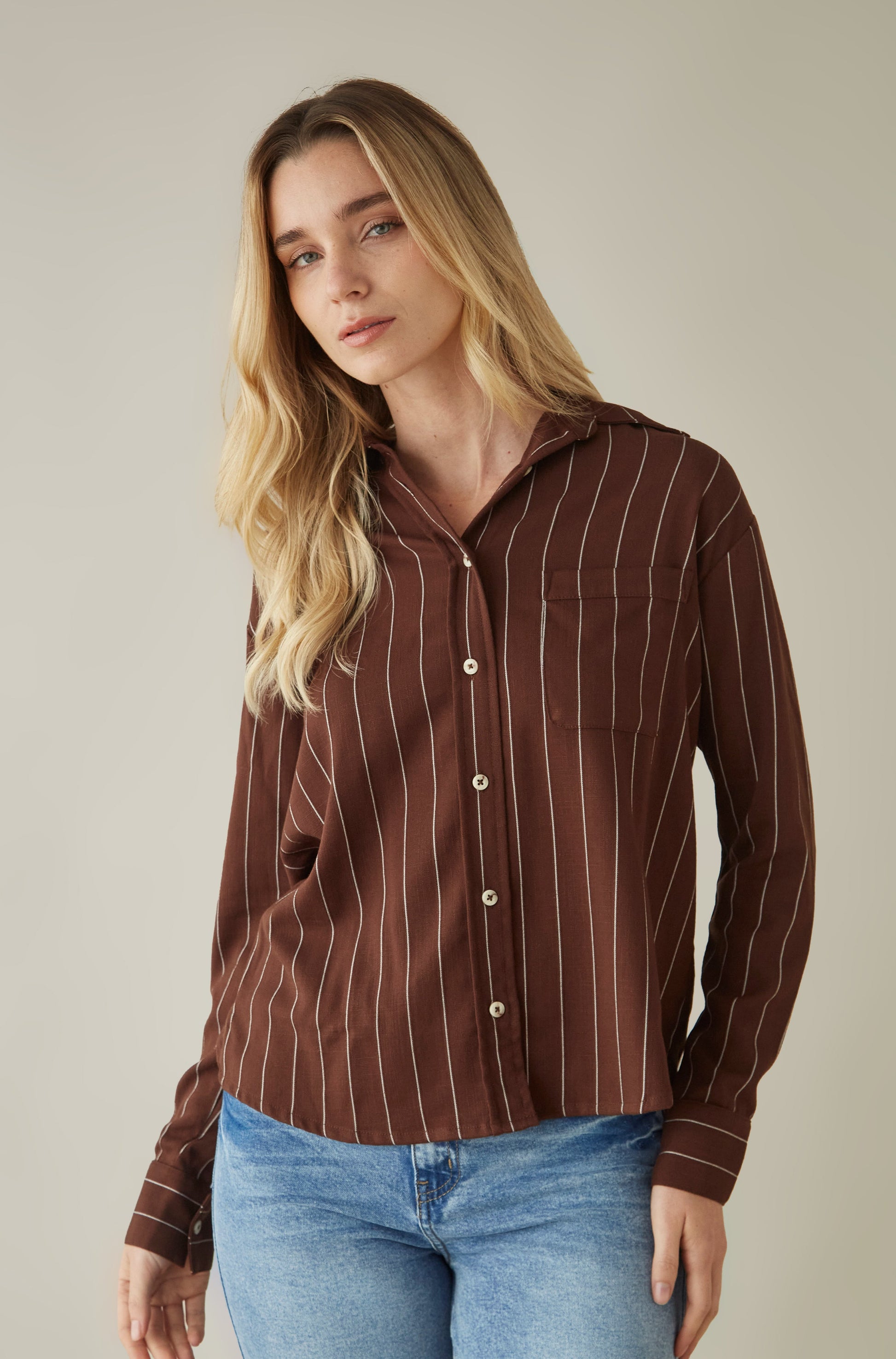Blusa de cuello y solapa manga larga con un bolsillo.