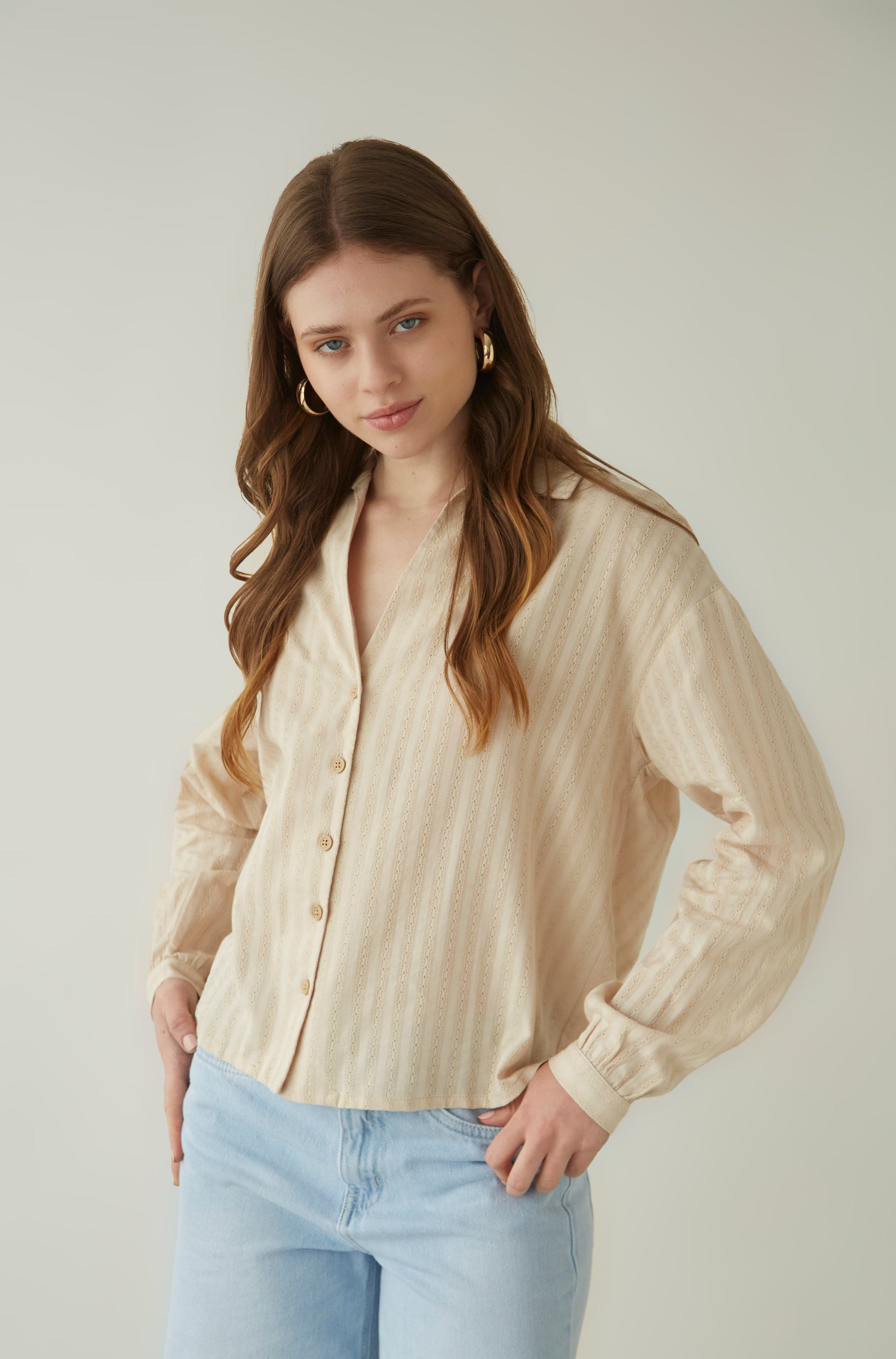 Blusa básica de cuello y solapa manga larga sin bolsillos.