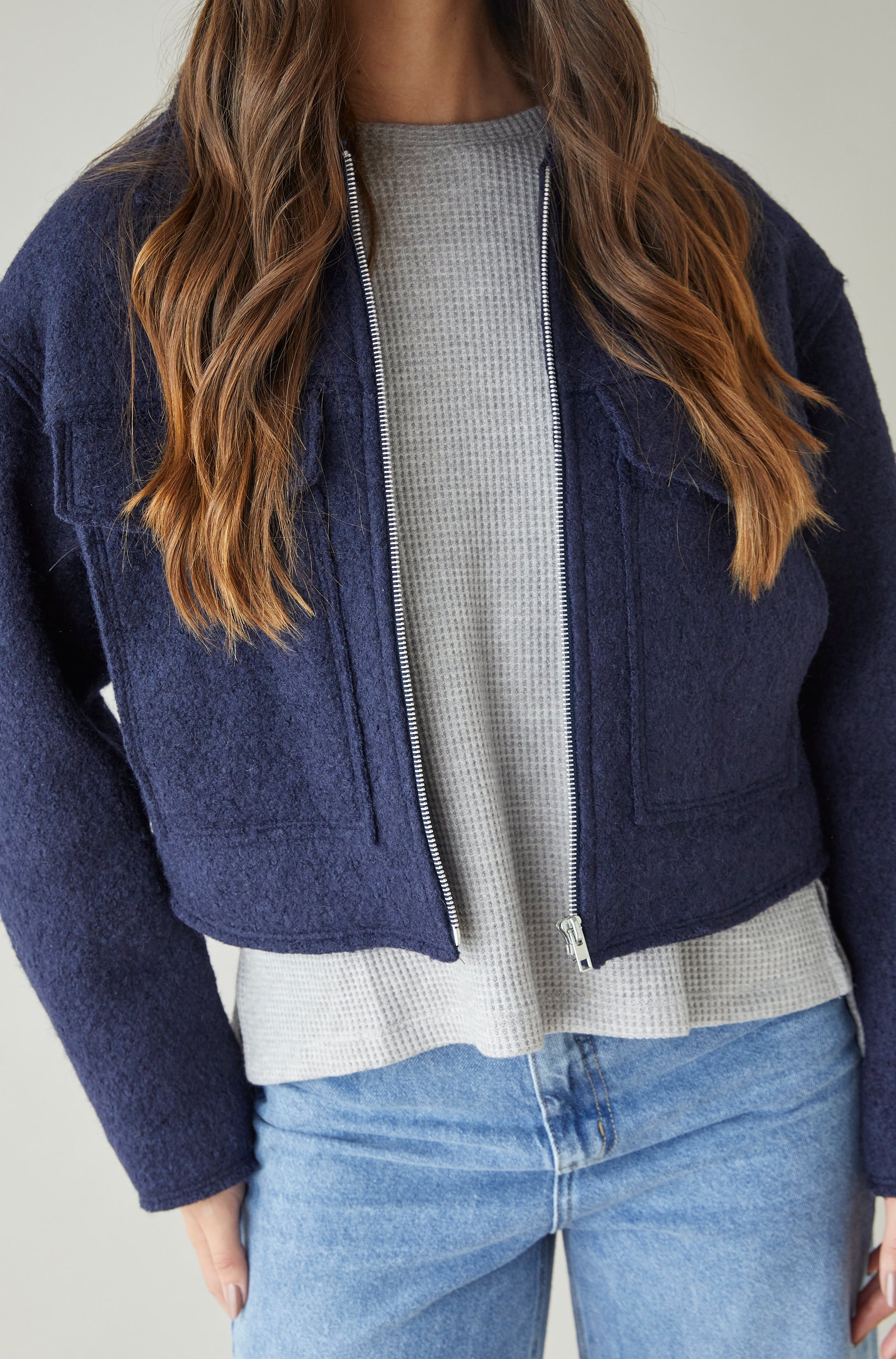 Casaca manga larga con cierre y dos bolsillos en delantero.