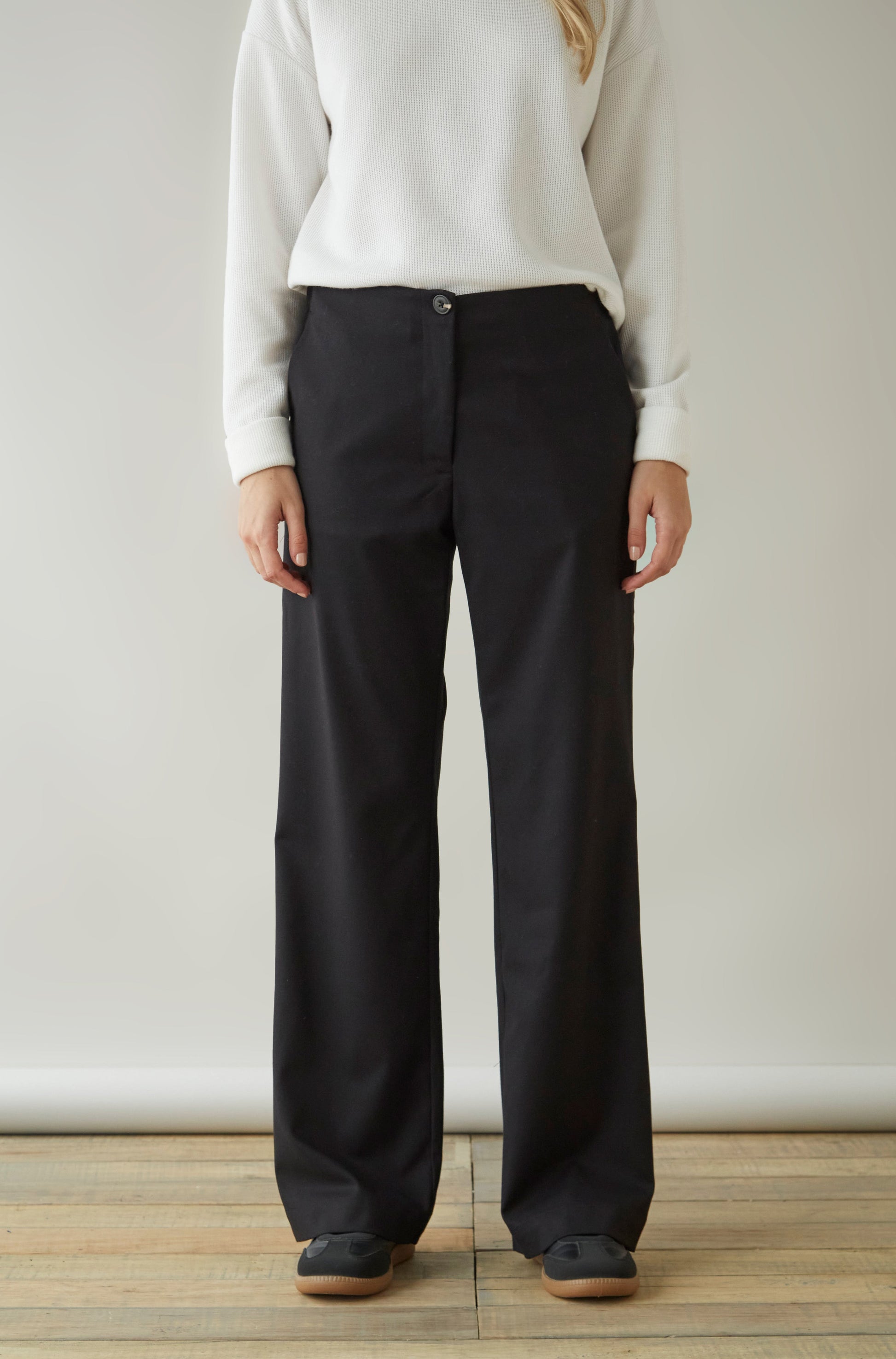 Pantalón de vestir sin pretina elasticado en espalda.