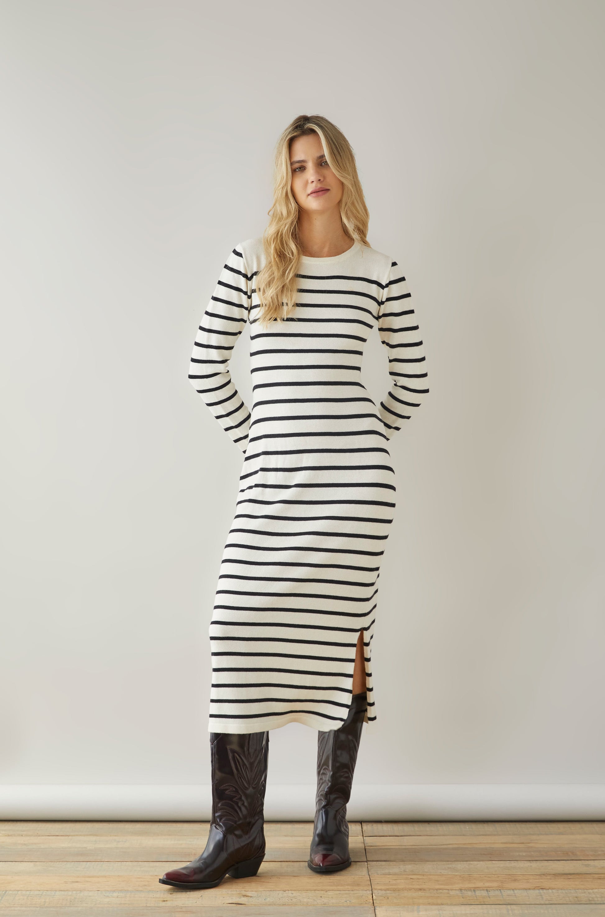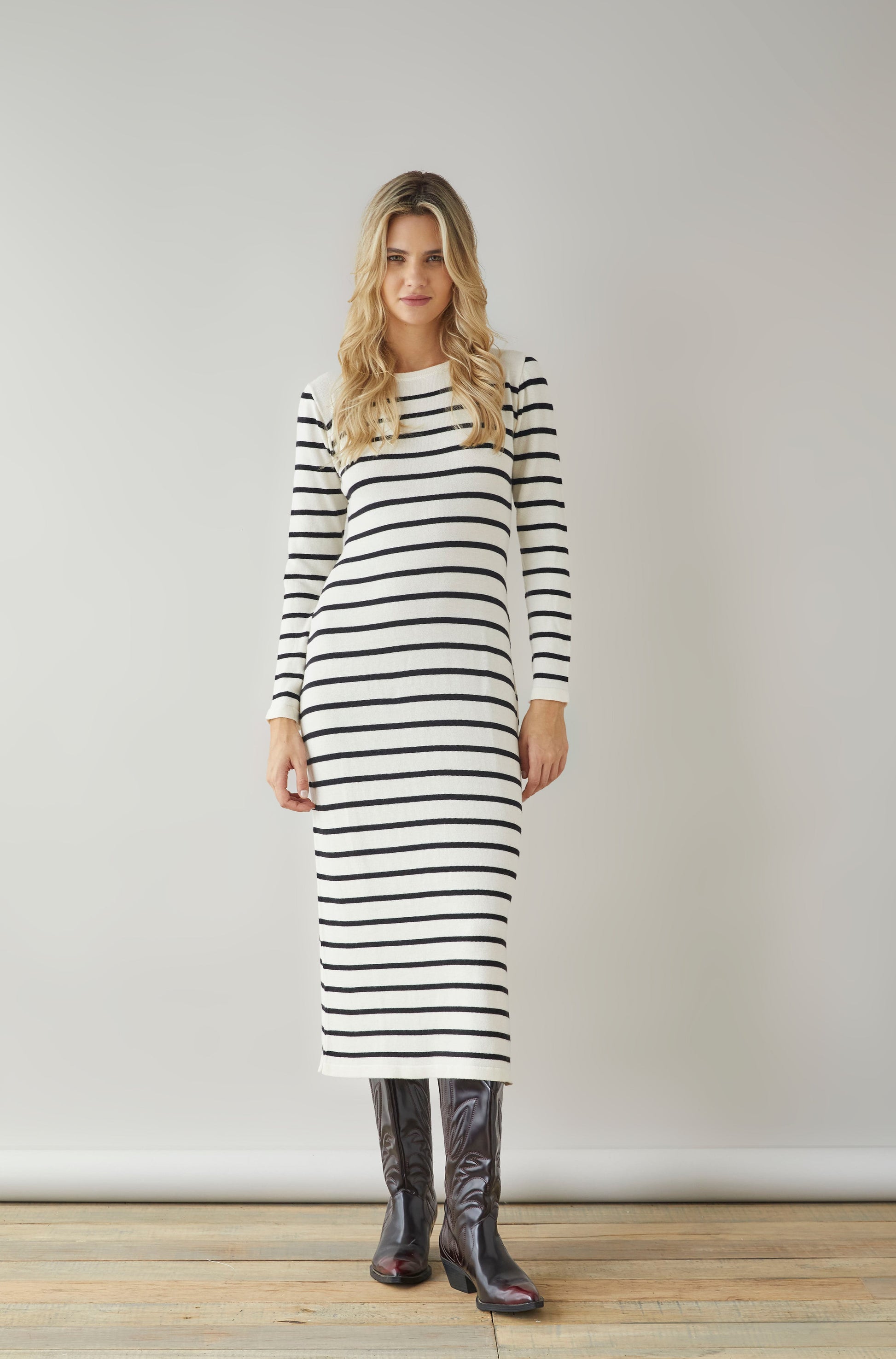 Vestido MIDI cuello redondo manga larga.