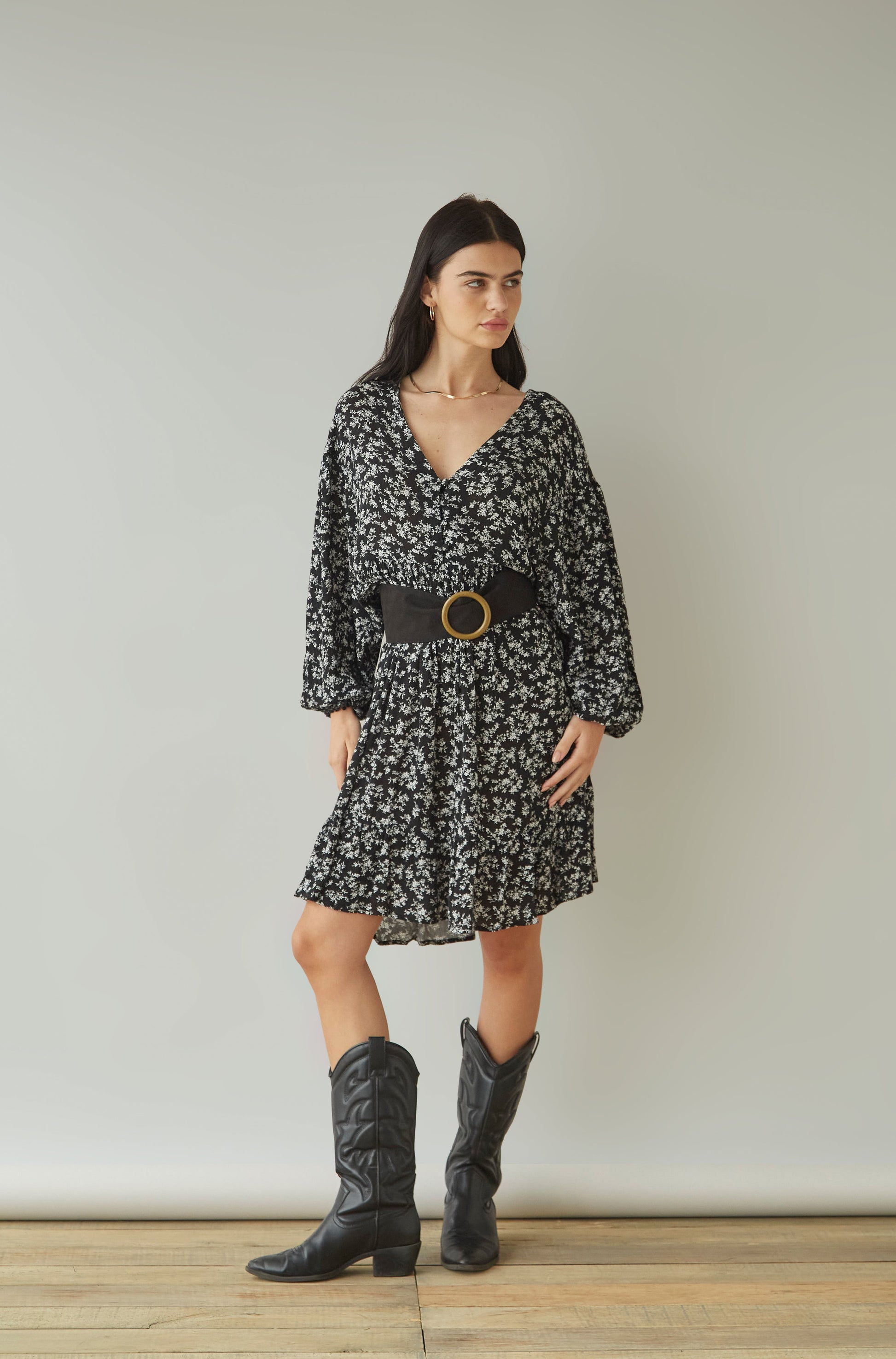Vestido corto escote V y mangas abullonadas.